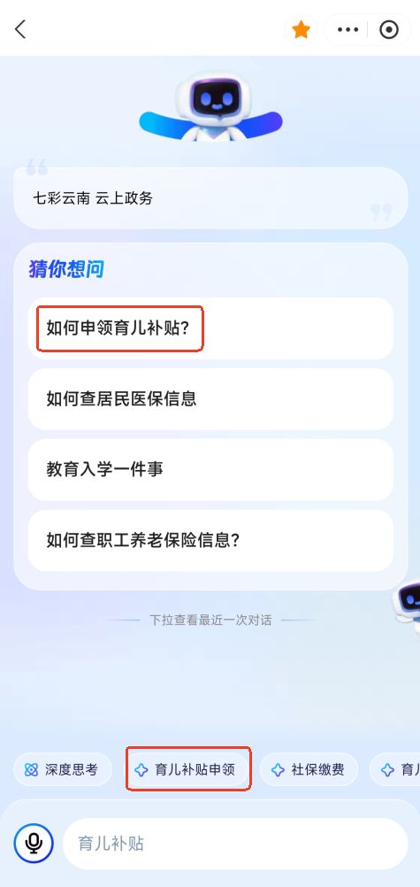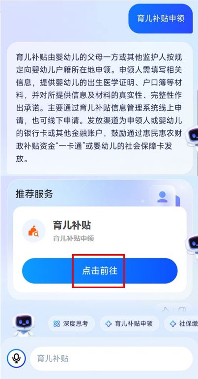 若您正在使用办事通小程序内【云事通问】政务智能客服,也可向智能客服咨询育儿补贴相关问题,同时智能客服会向您推送申领服务直达卡片,点击即可进入。