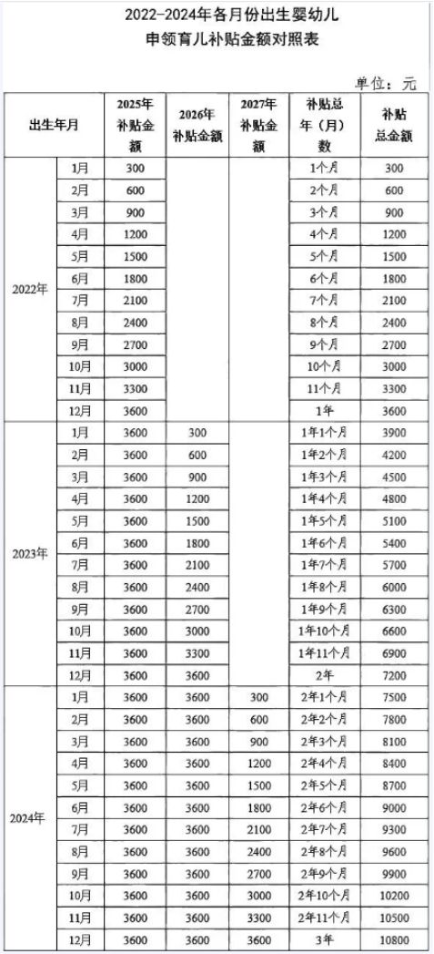 育儿补贴制度从2025年1月1日起实施,补贴对象为符合法律、法规规定生育的3周岁以下婴幼儿,至其年满3周岁。育儿补贴按年发放,现阶段国家基础标准为每孩每年3600元。育儿补贴不分城乡、民族、区域,也不分一孩、二孩或者三孩,实现三孩生育政策下家庭支持的全面覆盖,确保符合条件的婴幼儿能够平等享受补贴的待遇。其中,对2025年1月1日之前出生、不满3周岁的婴幼儿,按应补贴月数折算计发补贴。也就是说,2022年1月1日以后出生的符合条件的婴幼儿,都可以领取育儿补贴。