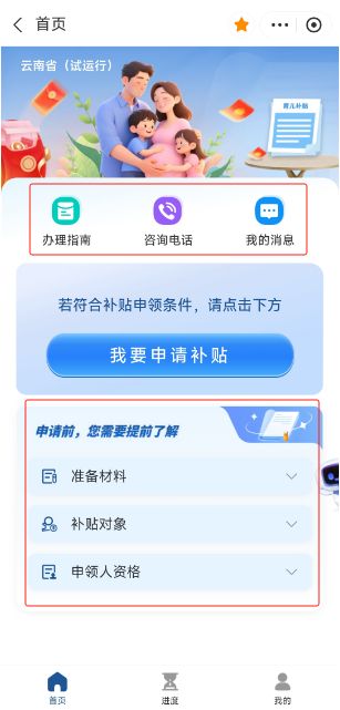 打开支付宝,搜索【一部手机办事通】可看到办事通核心政务服务推荐区域,点击活动页面或区域内【云南育儿补贴申领】即可便捷直达服务;或在办事通支付宝小程序首页里也能看到【育儿补贴】服务入口。