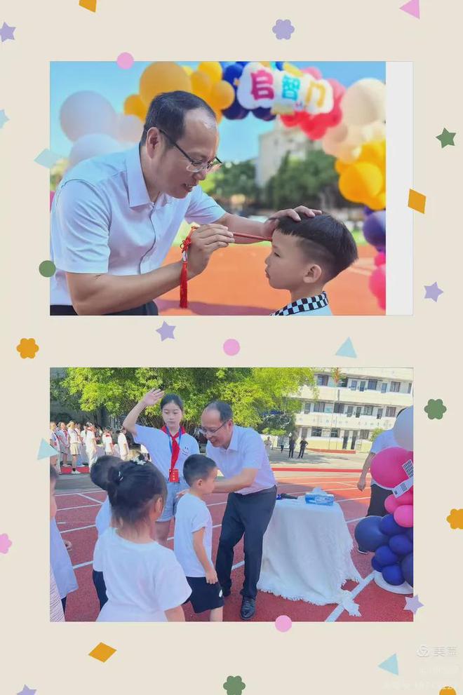 朱砂启智,眼明心亮:在启智门前,吴龙兵校长、郑柳芳副校长、周立英主任手持朱笔,为每一位新生眉心点上一颗鲜红的“智慧痣”,轻声送上“愿你聪明伶俐,好读书、读好书”等祝福。