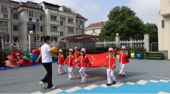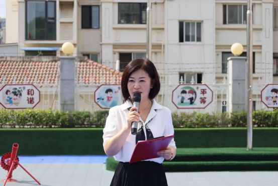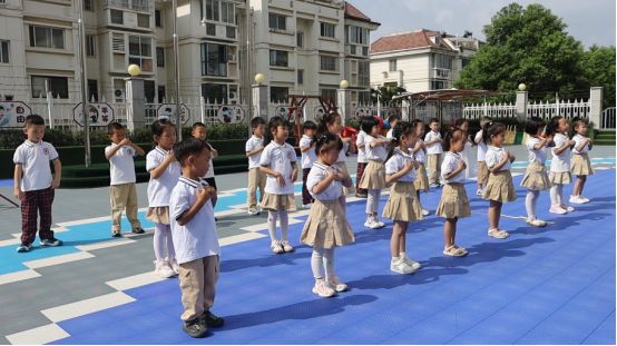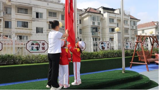 在这一系列充满仪式感的入园环节之后,幼儿园举行了庄严的升旗仪式。全体师生整齐列队,孩子们穿着统一的园服,小胸脯挺得笔直,眼神里满是认真。本次升旗仪式由陈继红园长主持,她用温和而有力的声音向孩子们致以新学期的问候。当激昂的国歌奏响,全体师生面向国旗,庄严地行注目礼,看着五星红旗在蓝天白云的映衬下缓缓升起,那鲜艳的红色在阳光下格外夺目,也在孩子们的心中播下了爱国的种子。