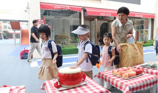跨过吉祥栏后,孩子们便迫不及待地参与到第二项仪式中:摸橘子、摸葱、敲鼓。老师们早已将金黄饱满的橘子、翠绿挺拔的小葱整齐地摆放在桌子上,旁边还放着一面小巧玲珑的红色小鼓。摸一摸橘子,新的学期大吉大利!摸一摸小葱,宝宝变得聪明伶俐!老师们温柔的话语在耳边响起,孩子们带着满满的好奇,伸出肉乎乎的小手轻轻触摸着橘子和葱。那橘子的光滑、小葱的清爽,都让孩子们觉得新奇不已。随后,他们兴奋地扬起小手,咚咚咚地敲响小鼓,清脆的声响里满是雀跃与期待。咚咚咚的清脆鼓声在幼儿园的每一个角落回荡,像是在敲响新学期的美好乐章,也敲出了孩子们心中的喜悦与期待。